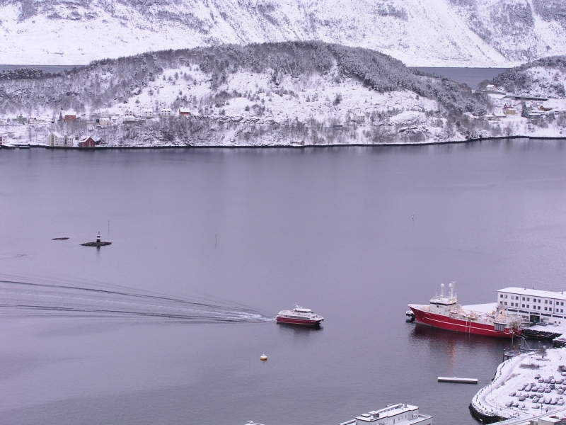 Zuerst hatte ich geplant am vergangenen Mittwoch mit dem von Dag in Bergen empfohlenen Postschiff von Trondheim nach Ålesund zu fahren (siehe Karte). Dann hat mich Åsmund – Gastgeber in Trondheim schließlich davon überzeugt am Donnerstag zu fahren. Der entscheidende Grund war nicht, dass er mich unbedingt weiter ertragen wollte, sondern dass an diesem Tag das älteste Schiff – nämlich die MS Nordstjernen von 1950 fährt und es damit “spannender” wird. Es ist erheblich kleiner als die anderen Schiffe der Hurtigruten (“schnelle Route” – der Name der Postschifflinie) und schaukelt damit auch ordentlich wenns mal ein paar Wellen gibt. Also habe ich den Rat befolgt und bin kurz vor 10 am Donnerstag an Bord gegangen. Schönes Boot dachte ich mir. Relativ schnell war dann klar, dass es draußen einen Sturm gibt – nichts schlimmes, aber eben so dass die Besatzung mitten in der 14-stündigen Fahrt angefangen hat alles festzuketten was nicht schon ohnehin fest war. Stühle, Tische, die Kasse und so weiter. Dann haben sie sich irgendwo versteckt und waren lange Zeit nicht mehr zu sehen. Das war kurz bevor wir den Schutz der Schären und Inseln vor der norwegischen Küste verlassen haben – diese sorgen normalerweise für niedrigen Wellengang für Schiffe nahe der Küste. Nun waren wir also auf offener See und schon gings los. Hohe Wellen und ein tierischer Schneesturm – da bin ich natürlich gleich auf Deck gegangen. Ne Weile fand ich das auch echt spannend wie das Schiff nicht nur ordentlich nach vorne und hinten, sondern auch nach links und rechts geschaukelt ist. Sehr authentisch. Eigentlich werde ich nicht so schnell seekrank, aber irgendwann war mir dann doch schon ganz schön schlecht. Bin dann wieder reingegangen und habe festgestellt, dass ein Haufen Zeug durchs Boot geflogen war und alles verstreut auf dem Boden lag. Hab dann ein paar Sachen weggeräumt und die große schaukelnde Glastür des Schaukastens geschlossen, die gefährlich durchsichtig durch den Gang wehte… Nach ner dreiviertel Stunde war mir dann schon ordentlich schlecht, aber letztendlich hab ichs überlebt und bin wohlbehalten in Ålesund abgekommen.